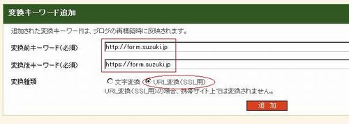 | 変換種類 | 「URL変換(SSL用)」を選択します。 |