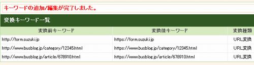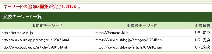 | 変換後キーワード | https://www.busblog.jp/category/12345.html https://www.busblog.jp/article/678910.html (※それぞれ、httpの後に「s」が入ります。) |